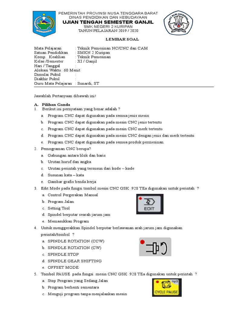 PEMERINTAH PROVINSI GORONTALO DINAS PENDIDIKAN KEBUDAYAAN PEMUDA DAN OLAH RAGA SMK NEGERI 1 SUWAWA Jln. Admin 06052020 Kelas XI 2 Comments 7075 Views. Download soal dan kunci jawaban cnc kelas xi.