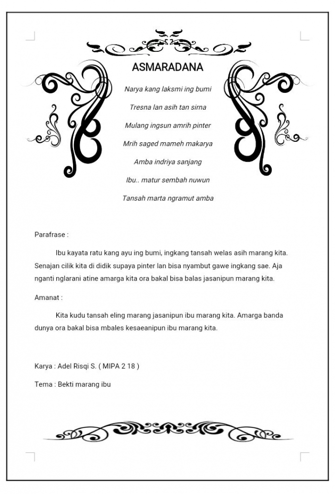 Memiliki Guru Wilangan 8 8 8 8 8 8. Menurut ahli tafsir sastra Jawa tembang macapat merupakan gambaran perjalanan manusia dari lahir sampai meninggal dunia. Tembang Asmaradana berasal dari.