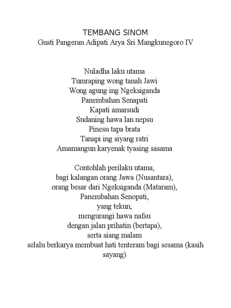 Tembang sinom yaitu salah satu dari 11 tembang macapat yang memiliki watak aturan serta makna yang menggambarkan masa masa remaja atau masa masa muda seseorang. Alasannya adalah jenis tembang ini adalah sebuah karya sastra Negara Indonesia yang berasal dari Pulau Jawa. Nulada laku utama Contohlah tingkah laku yang utama Tumrape wong tanah Jawi Bagi orang di tanah Jawa.